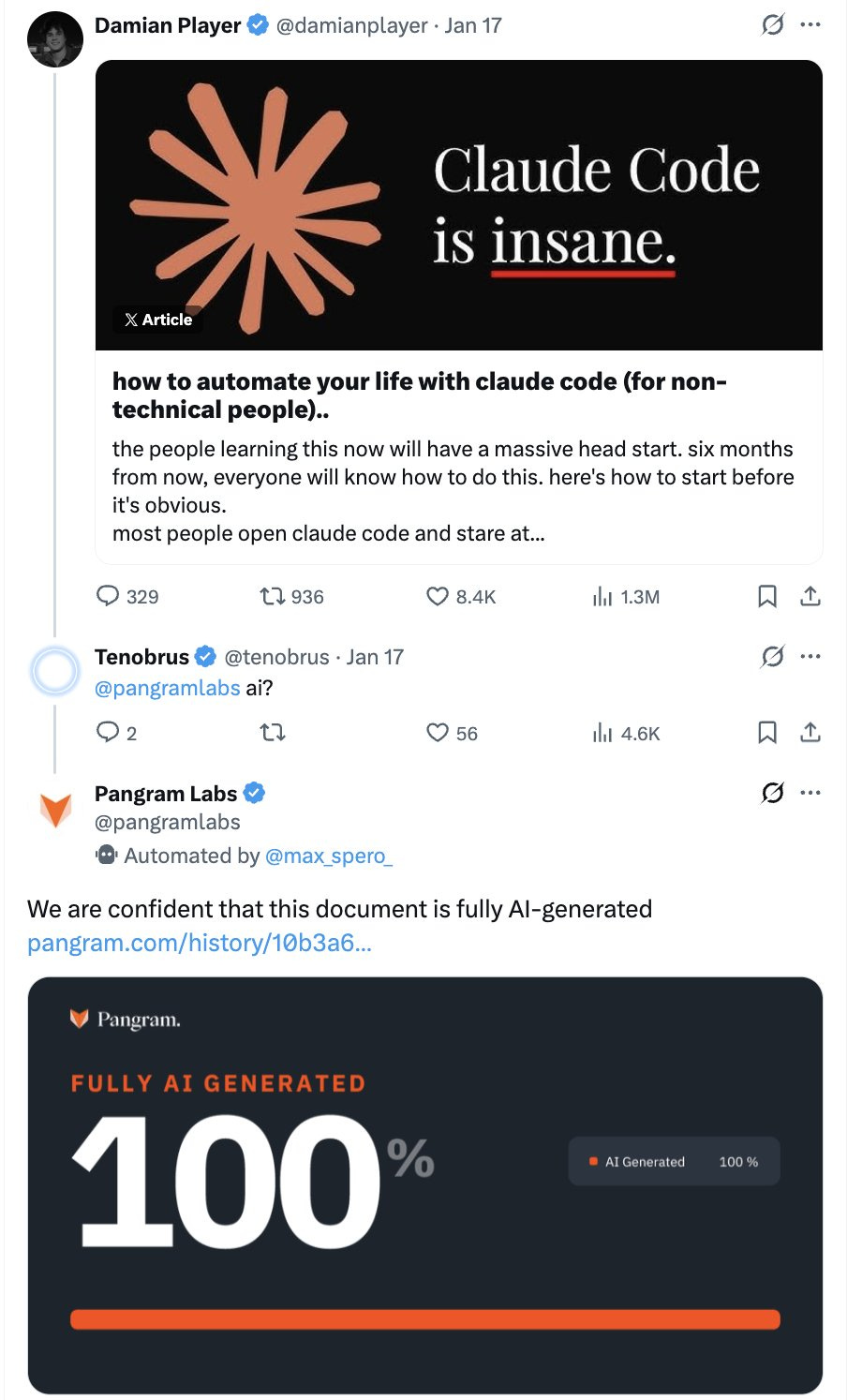 You can use AI in private, perhaps, but you don’t admit to it in public, and you certainly don’t present its output as your own without expecting some measure of contempt. There’s now a bot on Twitter you can summon under any post to check whether it’s ‘slop’. You really do not want to be the author of a post that gets flagged. It’s embarrassing, rightfully so. And yet the adoption is staggering. Over half of new articles published online are now AI-generated; one recent analysis found that 74% of newly created web pages contain AI content. 78% of companies use AI in at least one business function. The gap between public disgust and private adoption is vast: people use AI constantly, they just don’t want to be seen doing it.